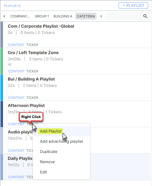 Click on any playlist to expand the window and show all the media items it contains. Playlists can contain content and tickers.