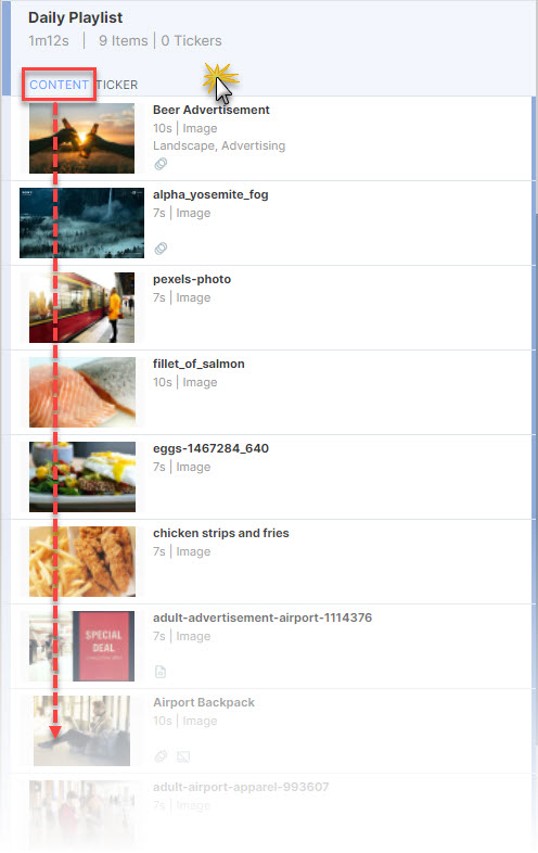 In the example below, we can see the highlighted Content button showing the number (4). This means there are 4 media items in the playlist. Content is the default view.