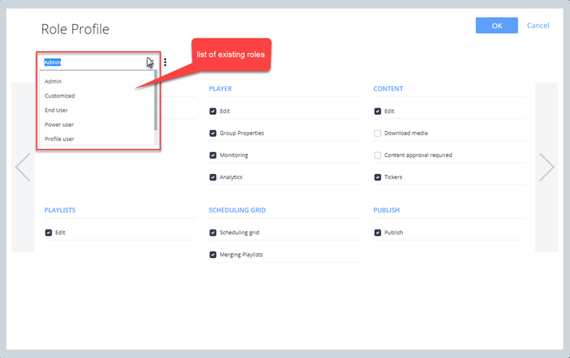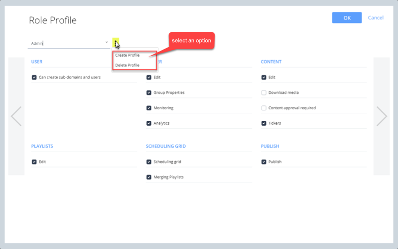 - To create a new role, click the options icon right of the pull-down menu and select Create Profile.